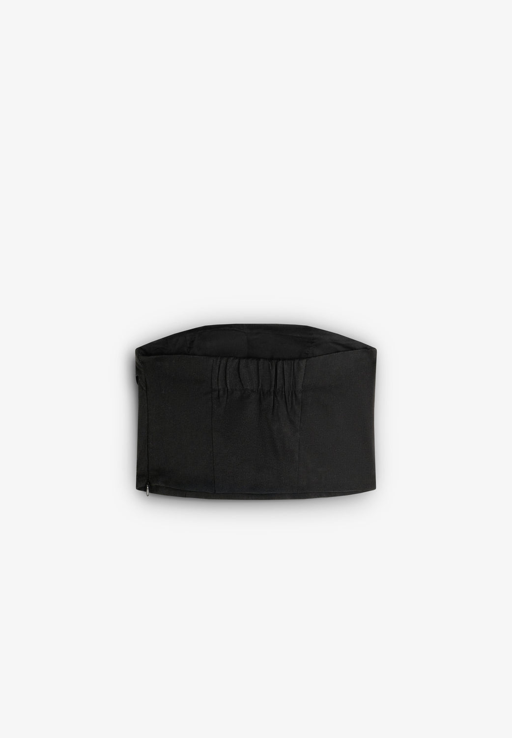 Top confeccionado en lino con detalle de ondas. Corte slim fit, palabra de honor, cropped con pinzas delanteras y nido de abeja en espalda elástico.