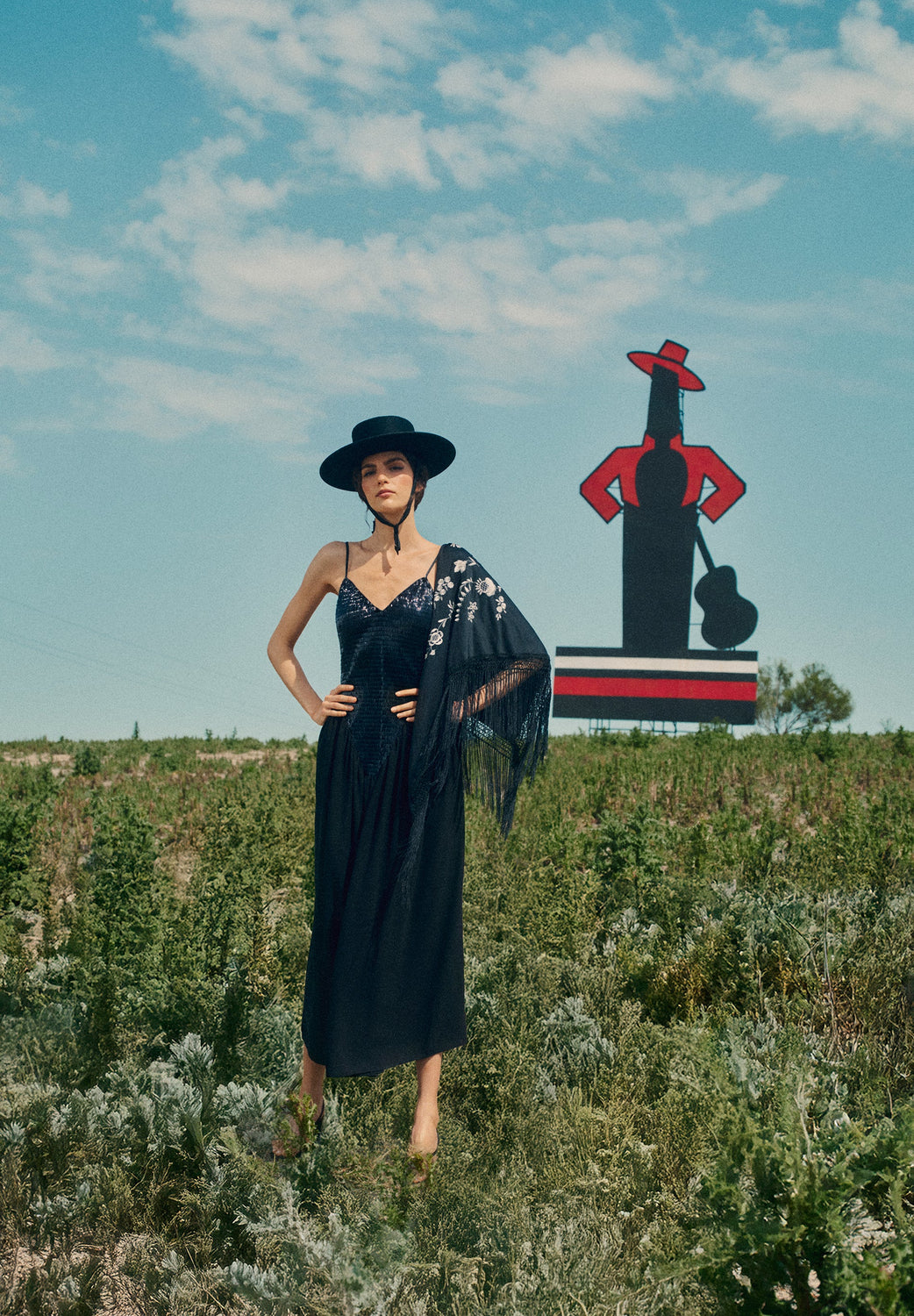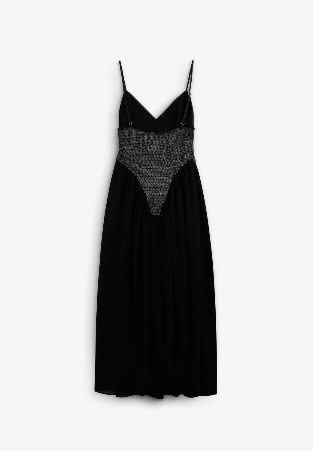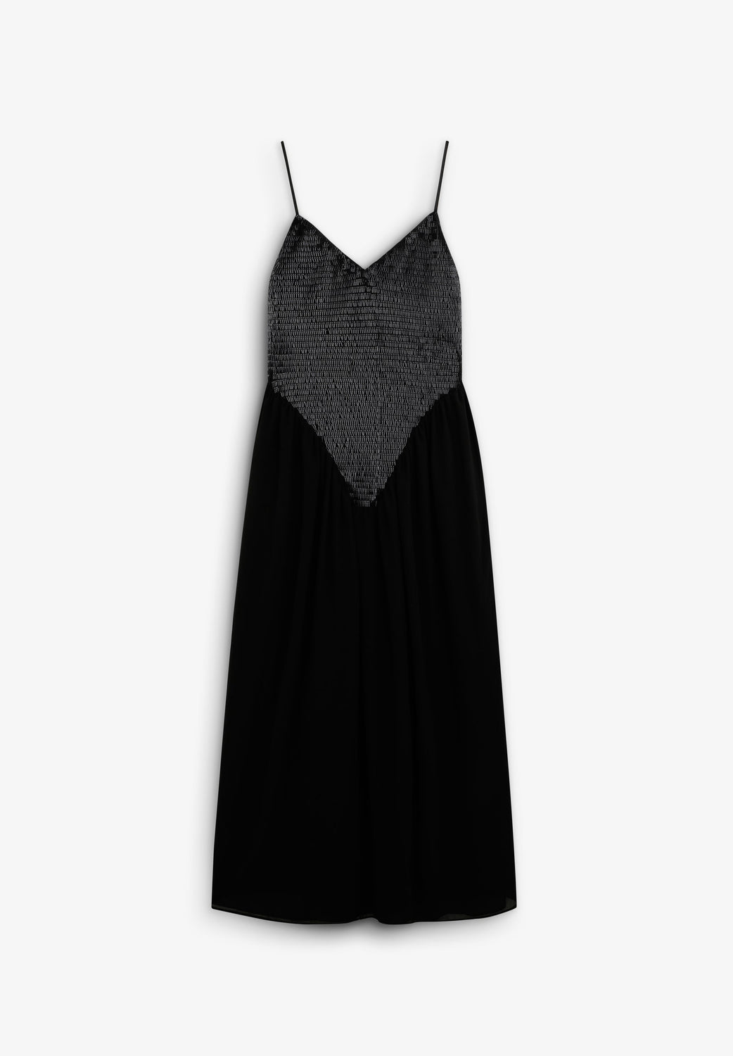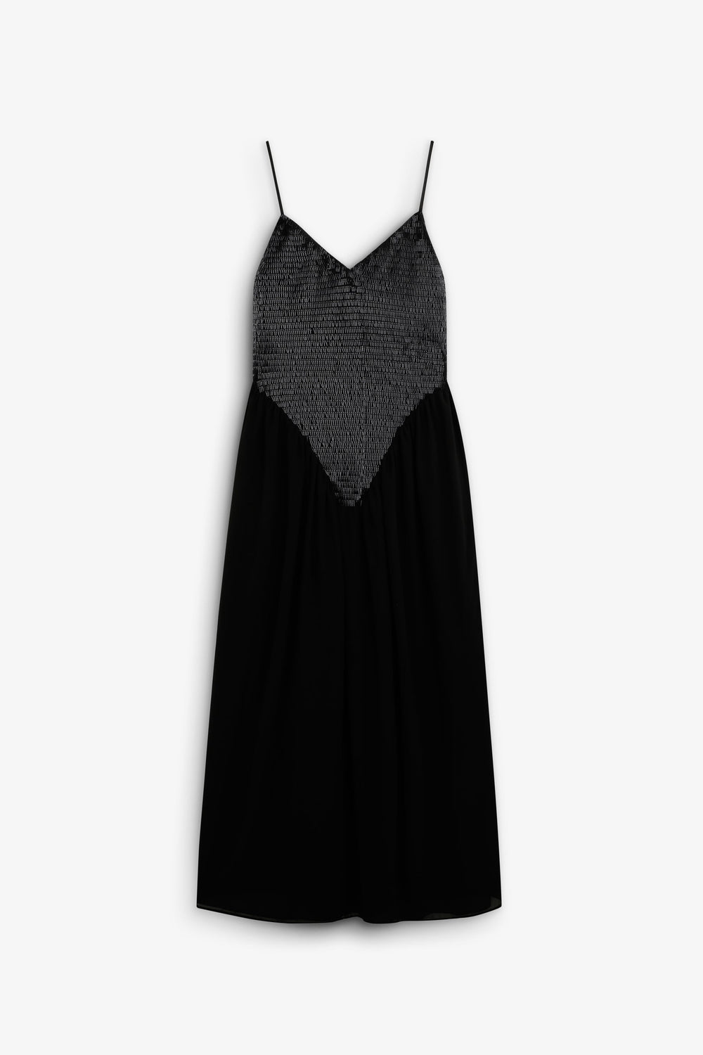 Vestido confeccionado en tejido fluido y lentejuelas. Corpiño de lentejuelas, escote en V y tirantes finos ajustables. Falda con ligero vuelo.