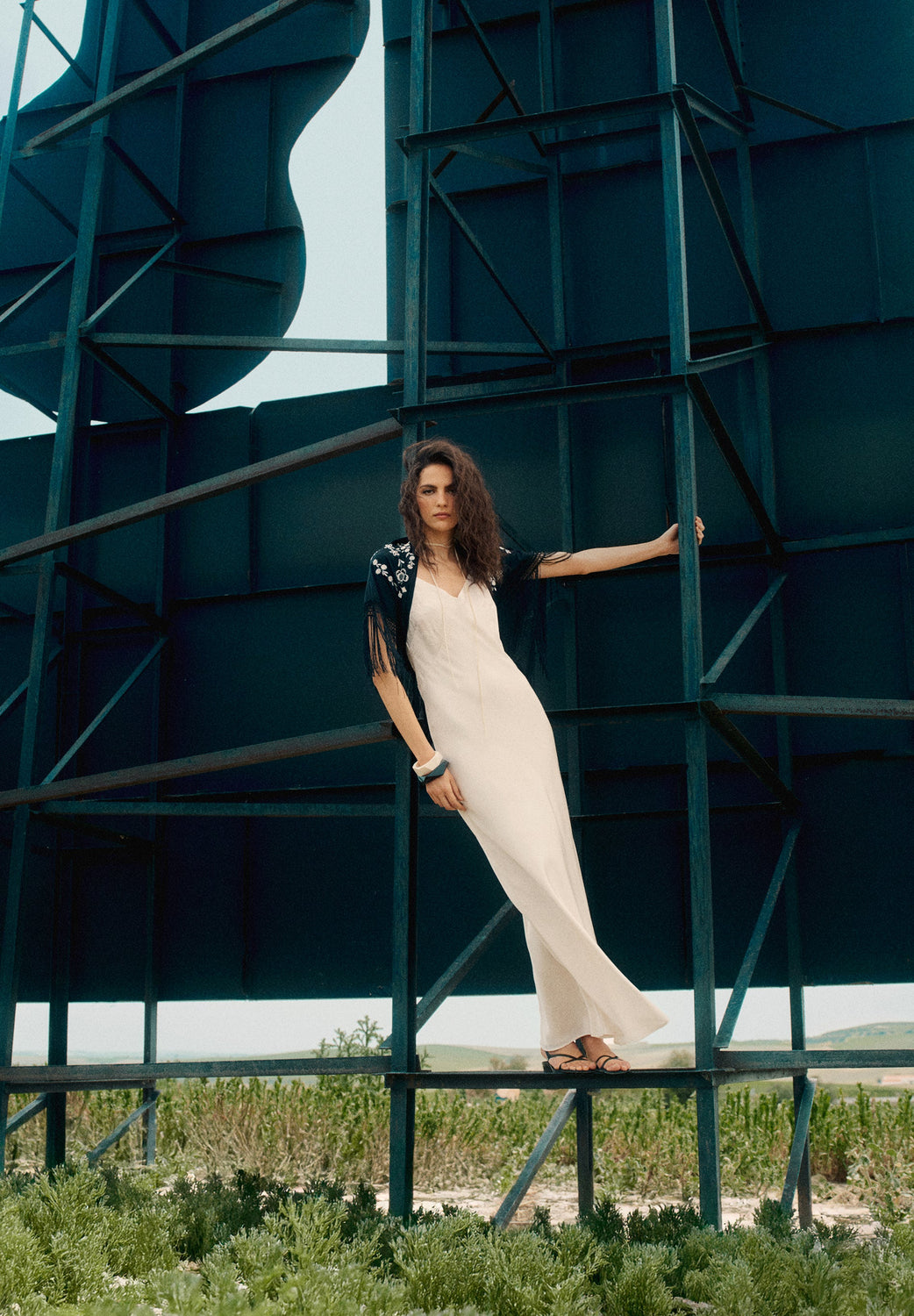 Vestido confeccionado en tejido fluido con textura . Corte slim fit, largo, con tirantes finos ajustables. escote en V.