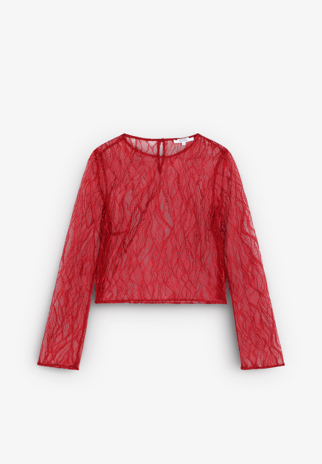 Top semitransparente de encaje. Regular fit, cuello redondo y manga larga. Cierre trasero con botón.