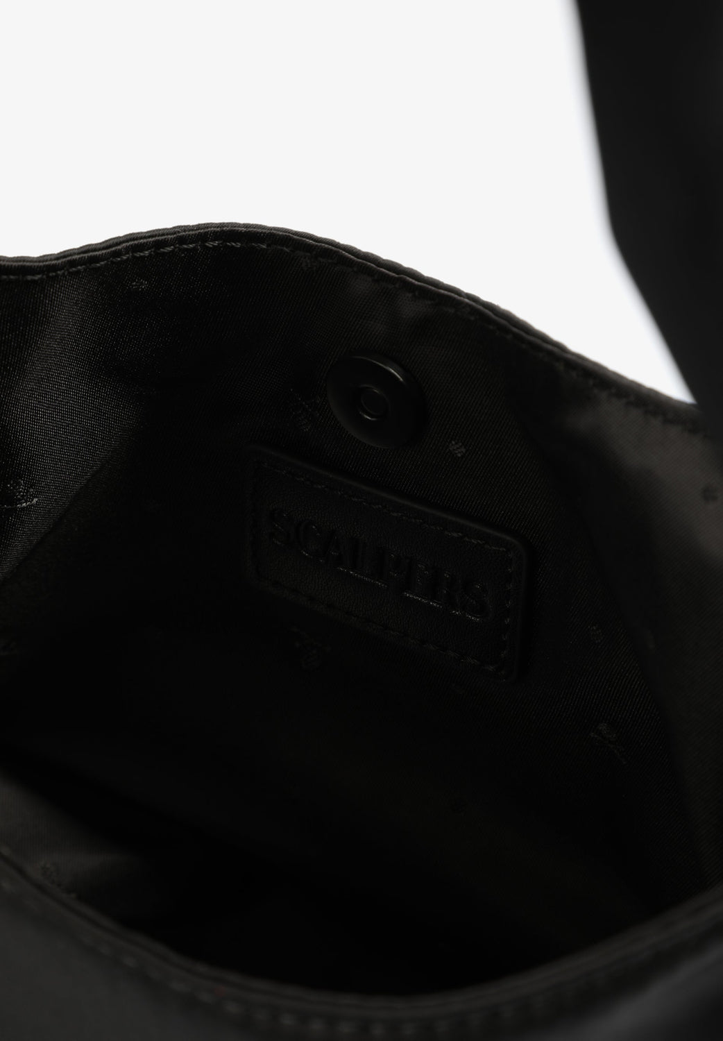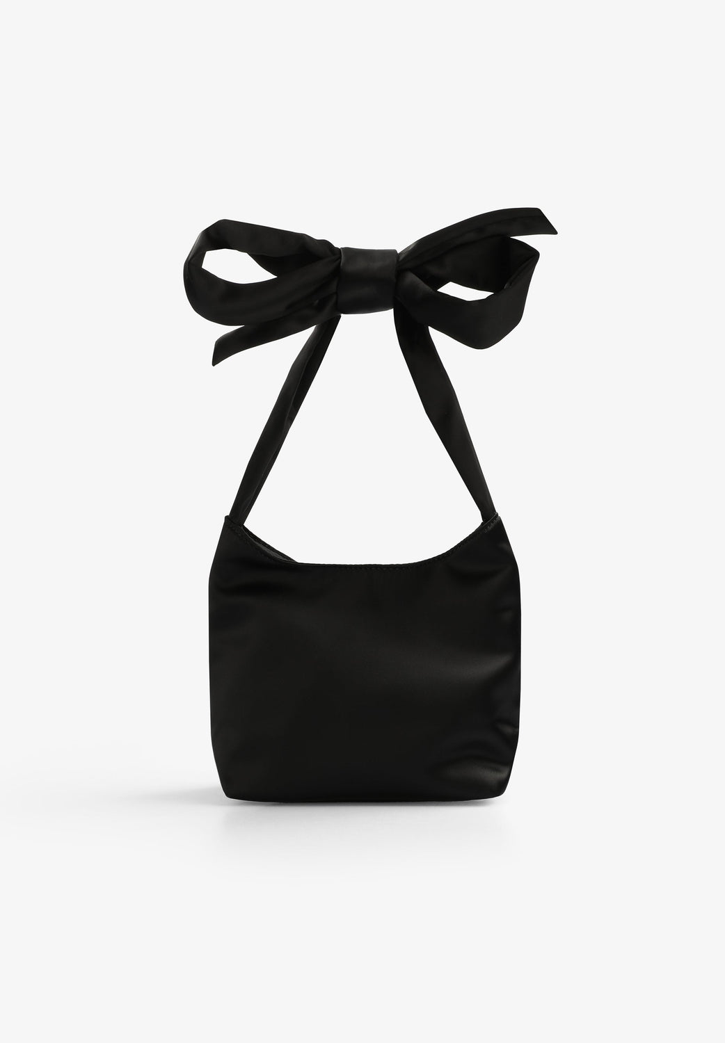 Bolso confeccionado en tejido ligero. Asa larga a modo de lazada y cierre con imán. Logo metálico en la parte delantera.