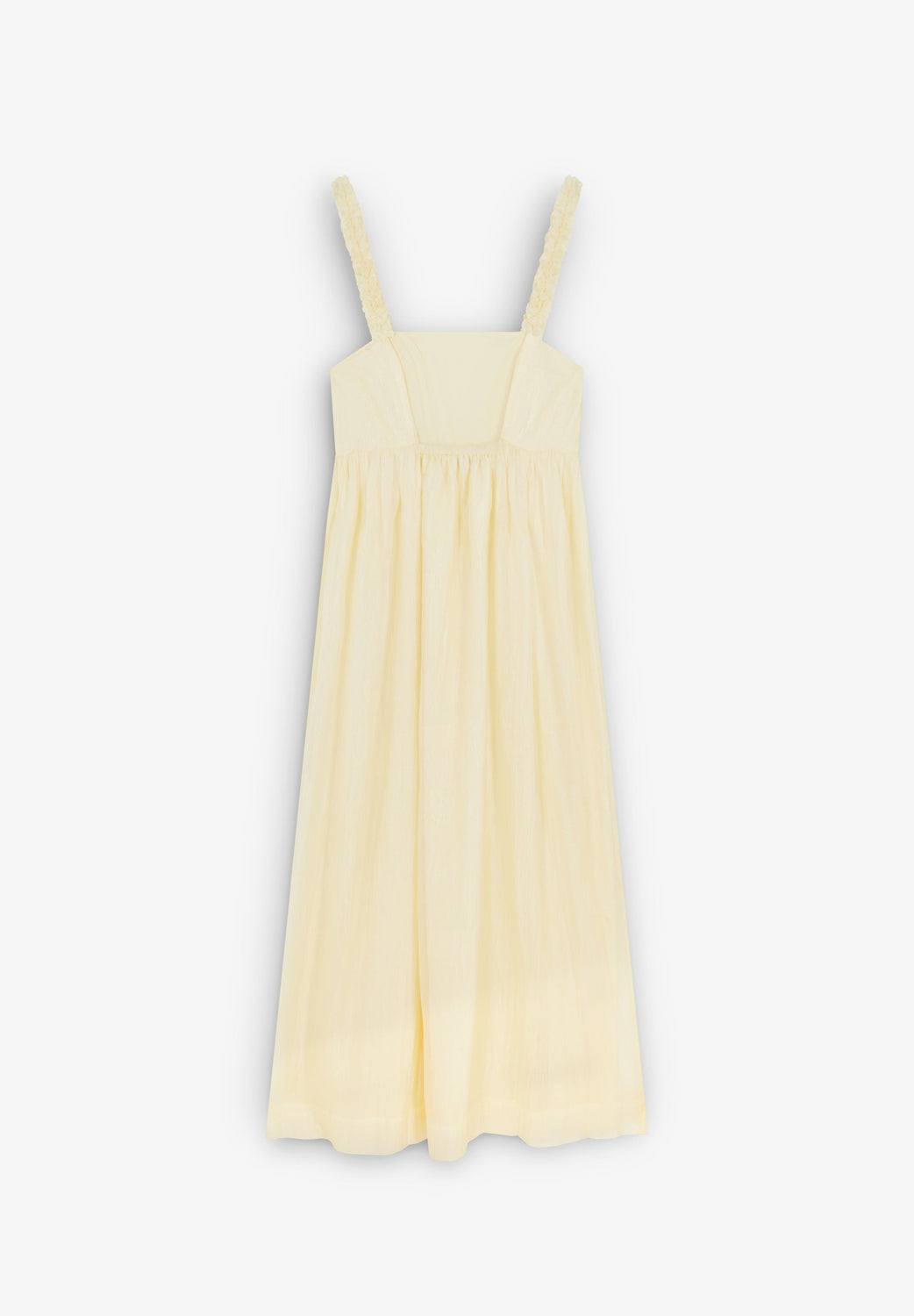 Vestido largo fluido escote en cuadrado. Tirantes anchos fruncidos. Detalle ajustado en escote. Forro interior.