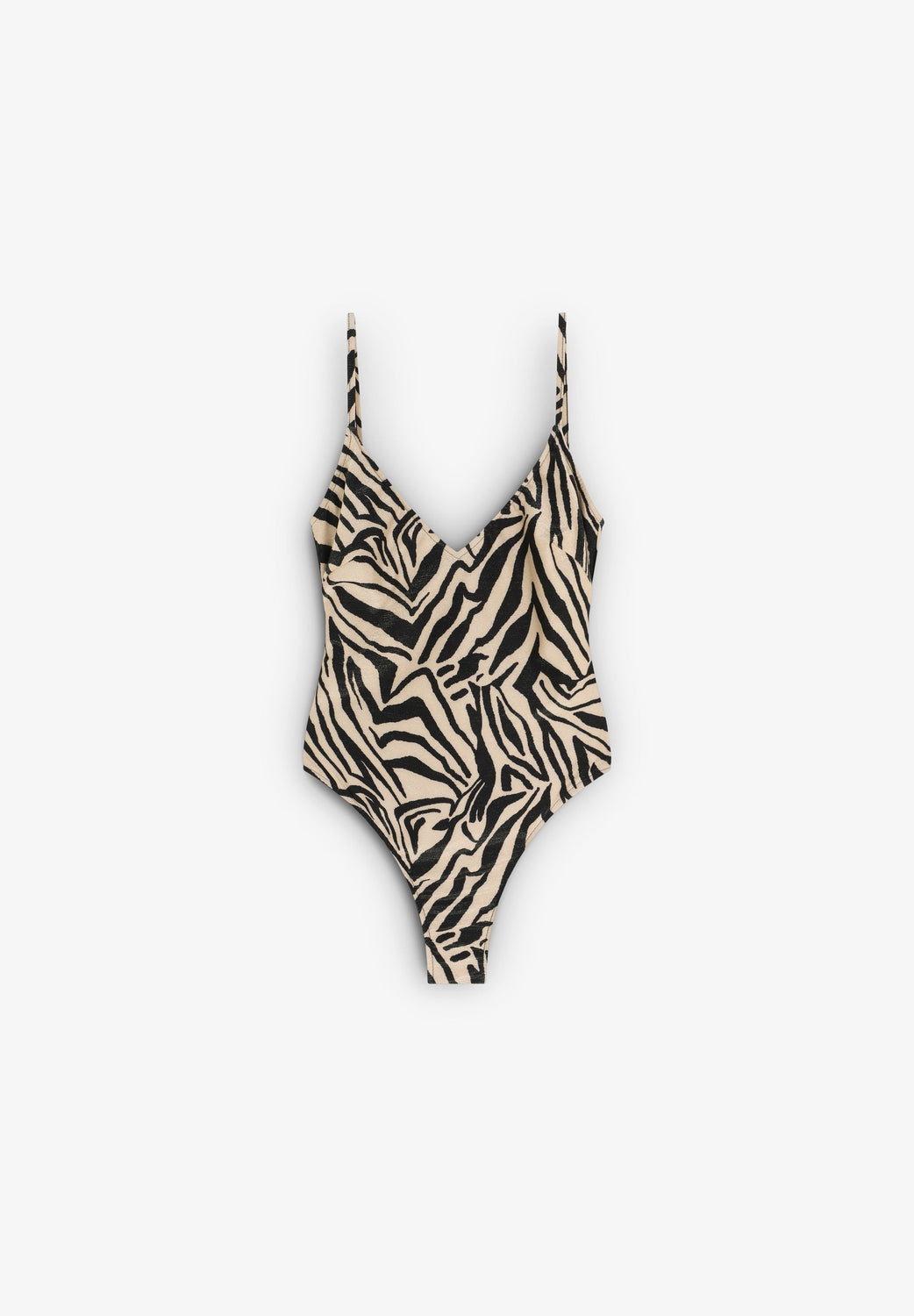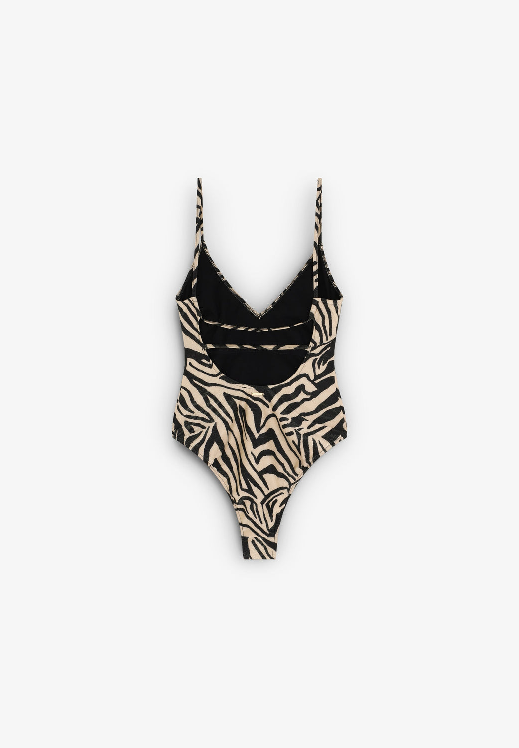 Bañador confeccionado en tejido técnico con estampado animal print. Escote en V con tiras y abertura en espalda.