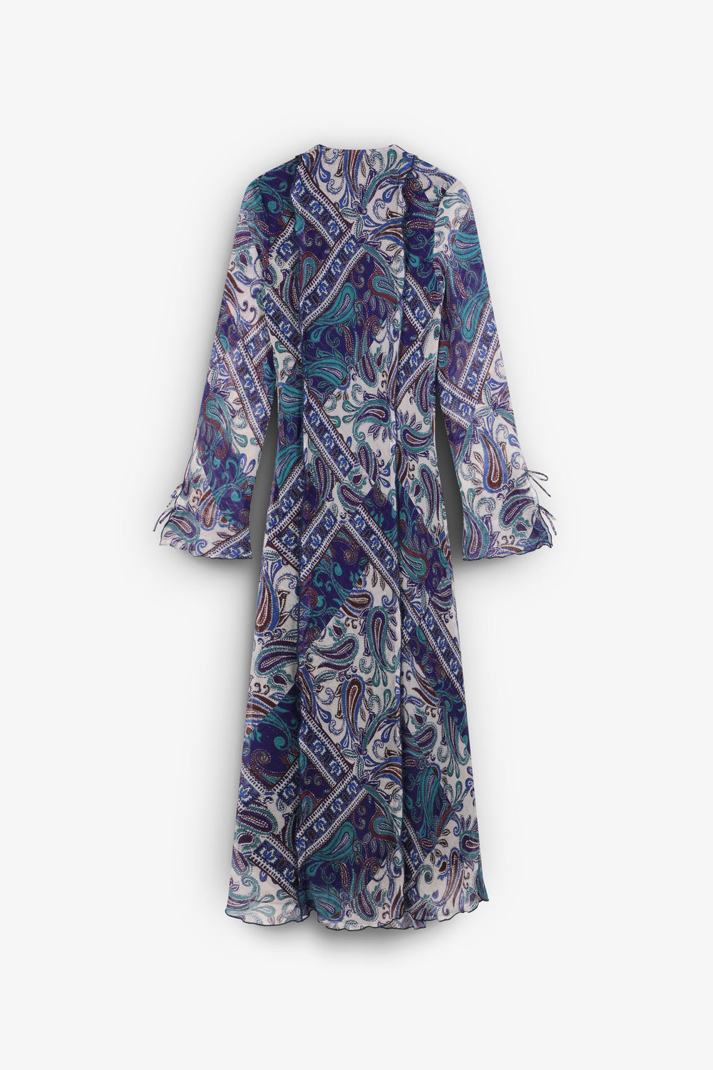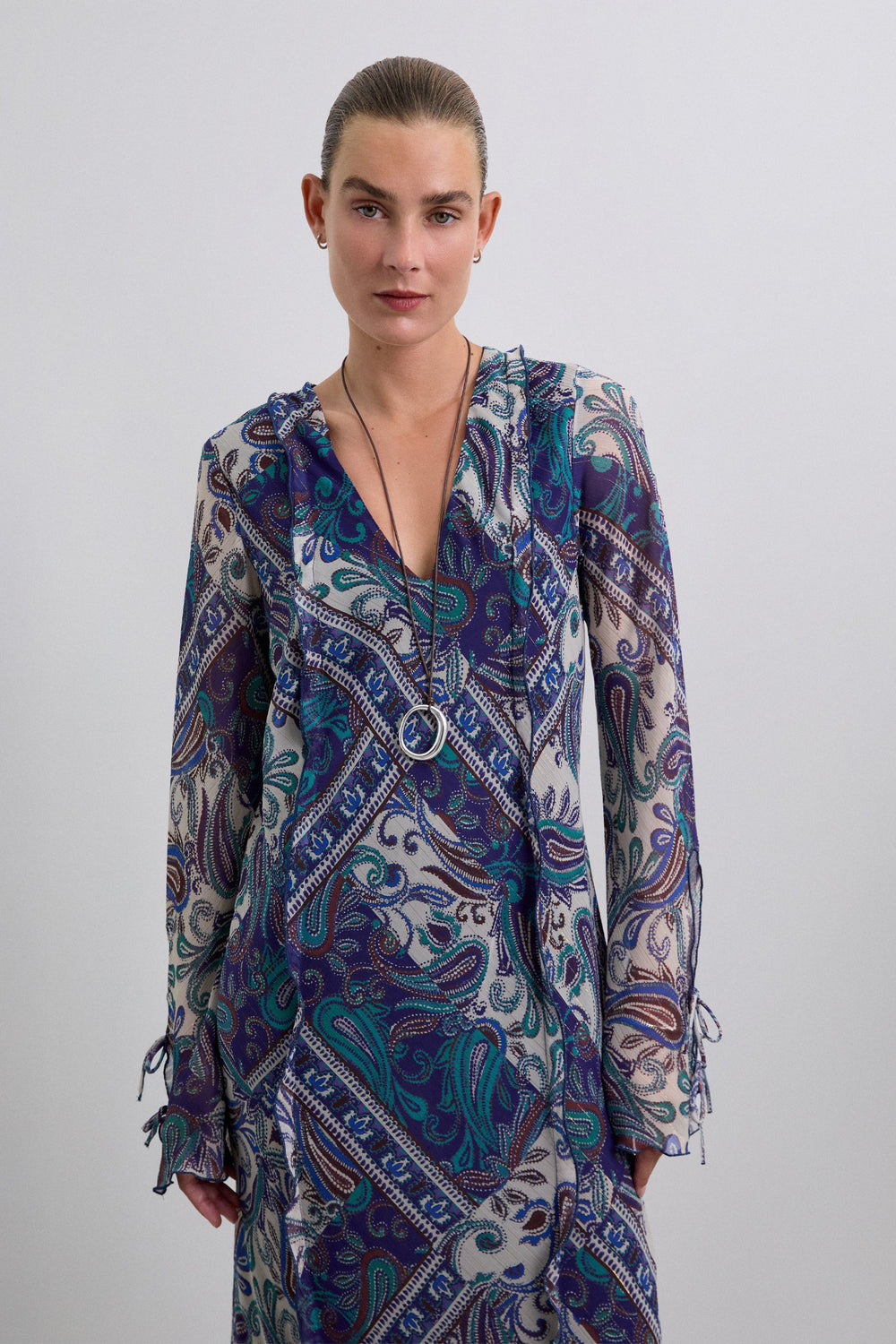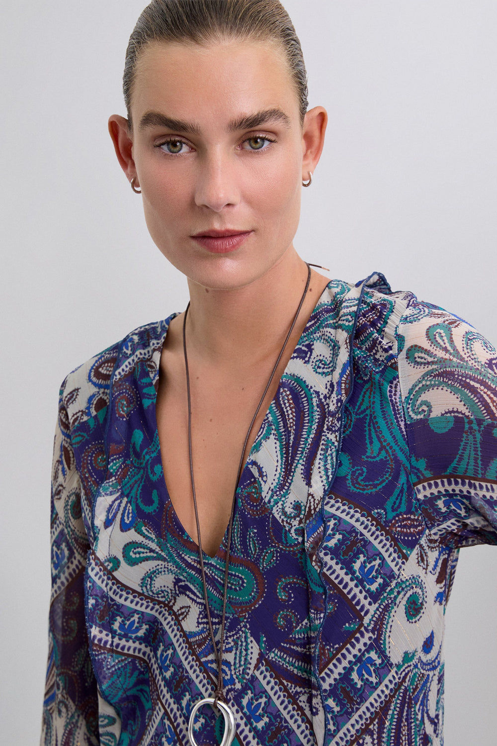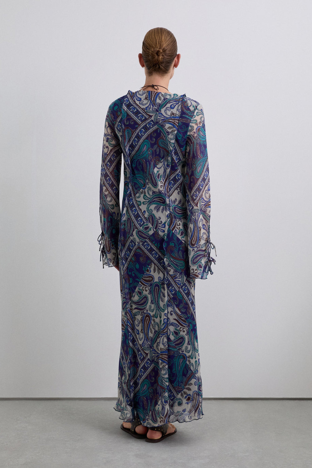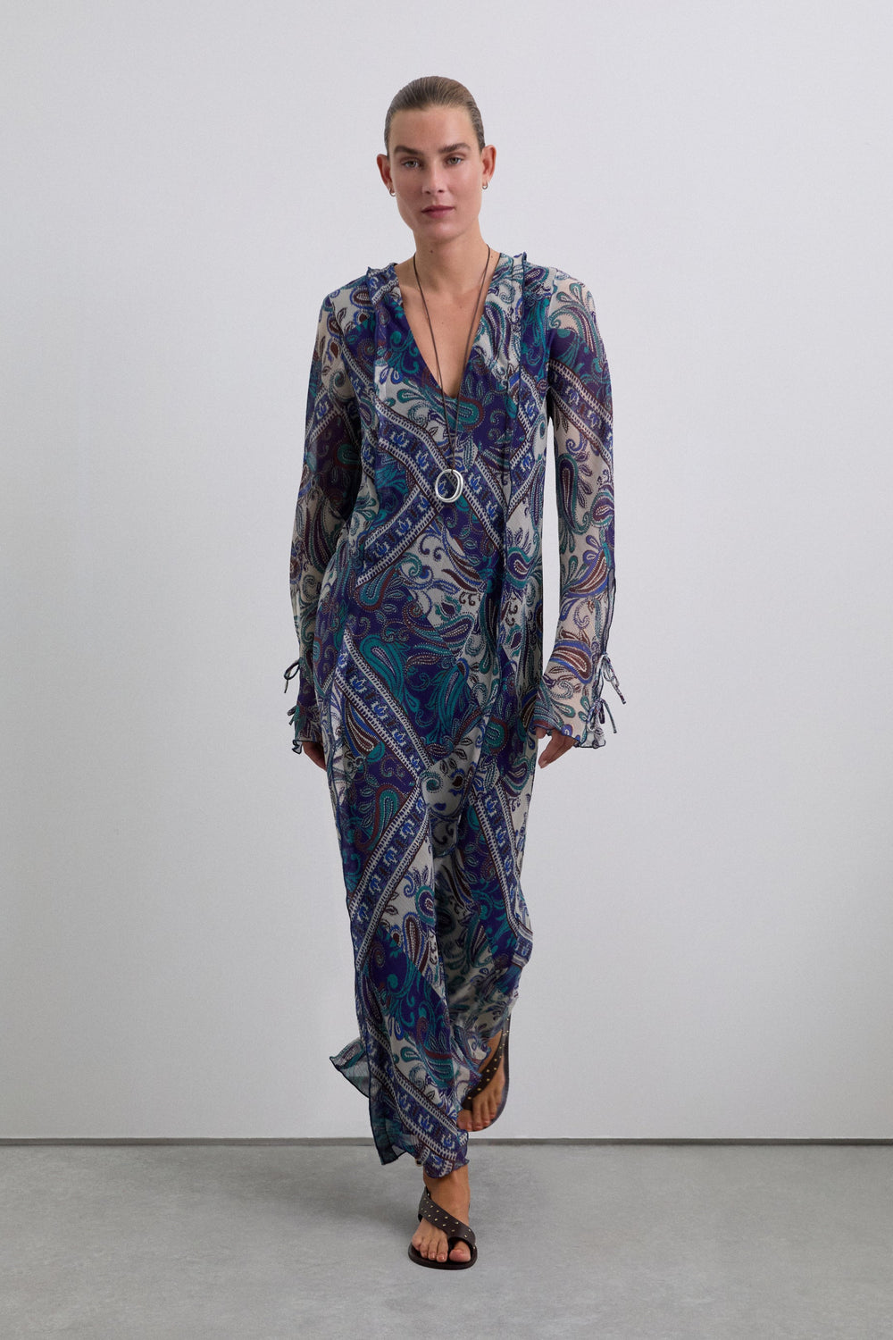 Vestido largo con print paisley confeccionado en tejido fluido con fibra metálica. Regular fit, escote de pico. Manga larga terminada en lazada y detalle de pliegues.