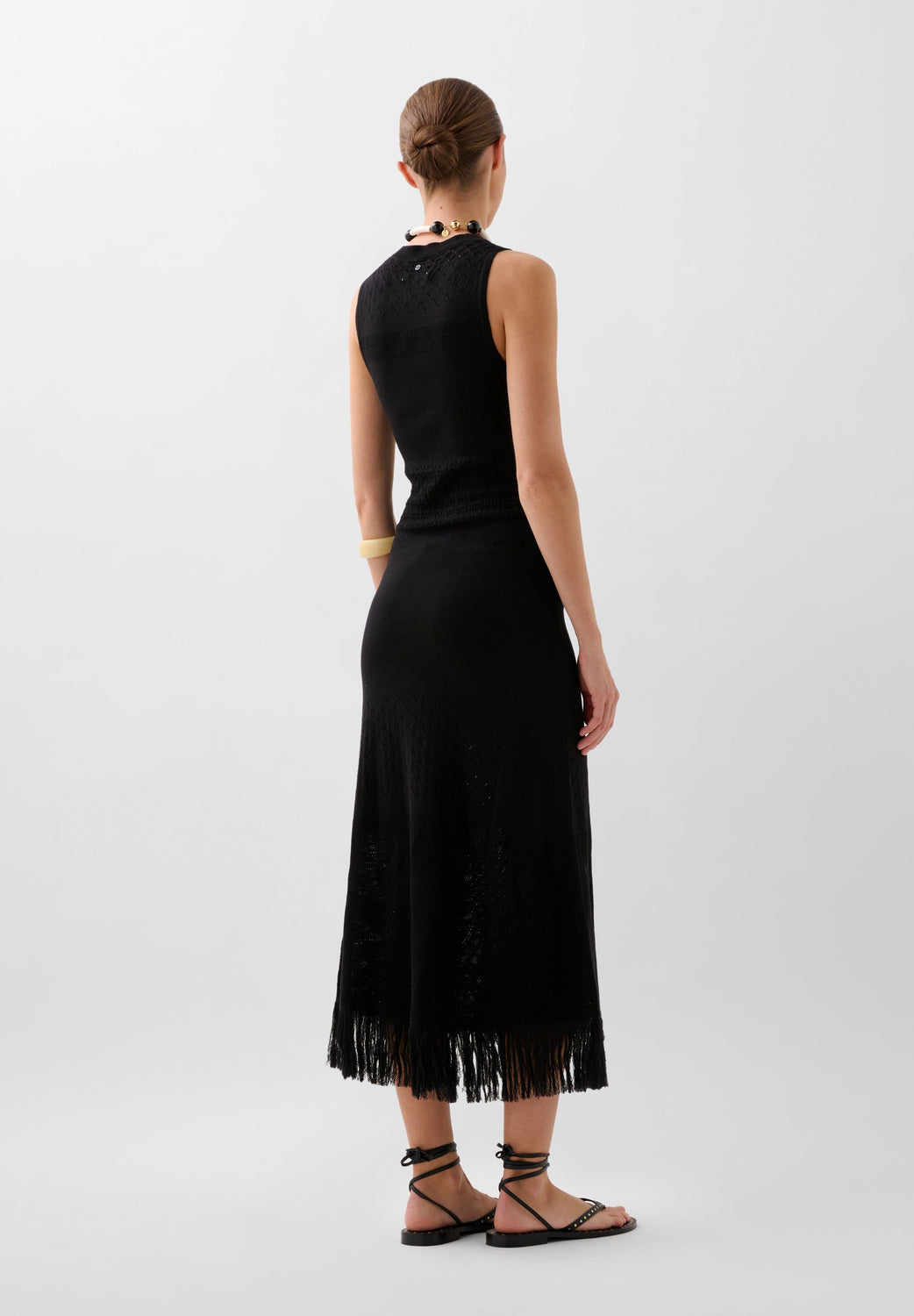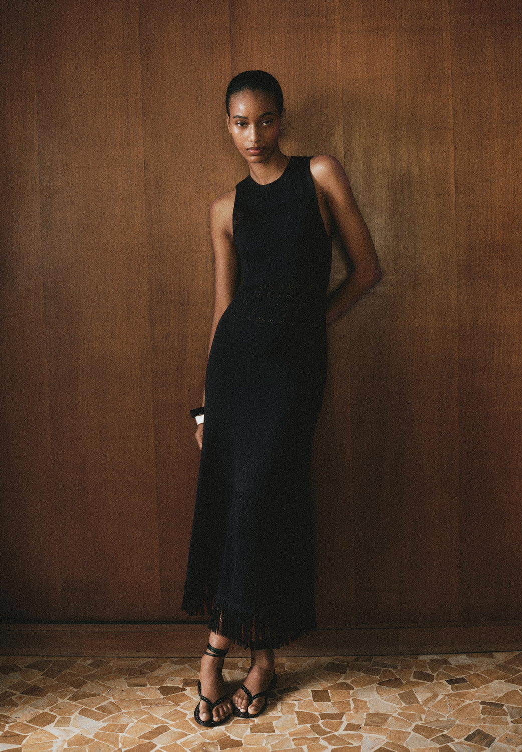 Vestido confeccionado en punto ligeramente elástico. Corte Regular fit, cuello redondo y manga en sisa. ligeramente A Line, con terminación de flecos en el bajo.