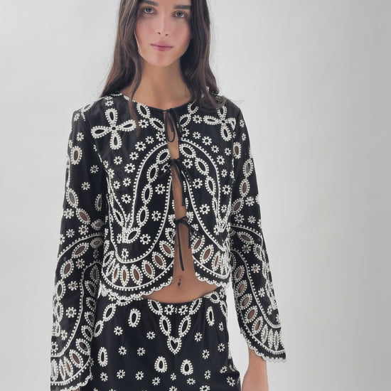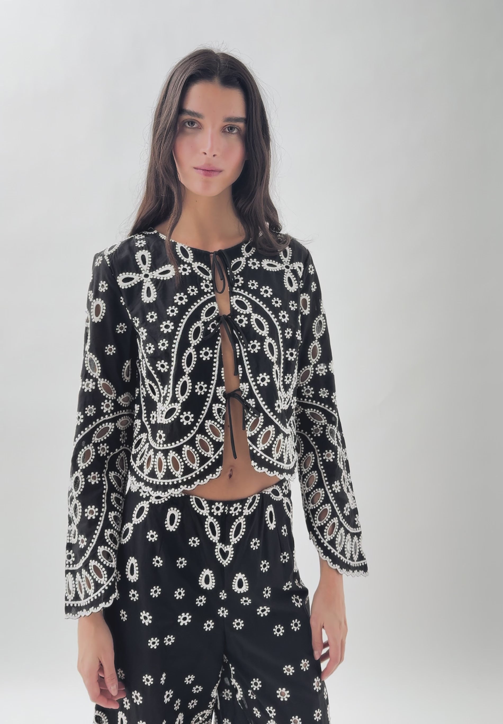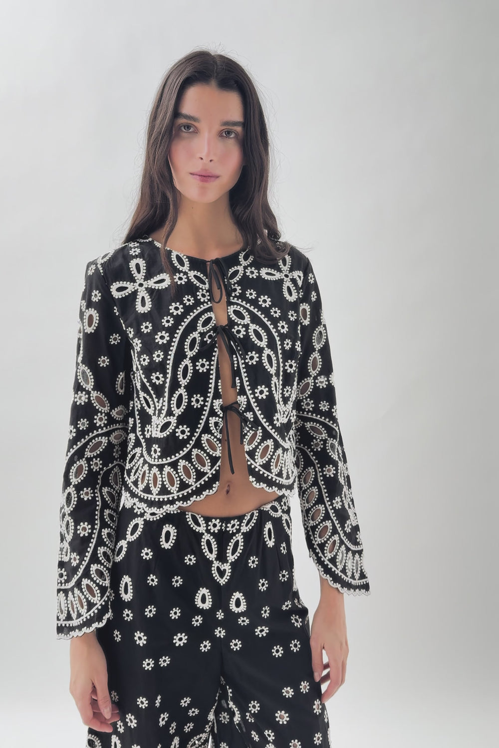 Camisa confeccionada en 100% algodón con bordados a contraste. Corte regular fit, cuello redondo y manga larga ligeramente acampanada. Cierre con lazos frontales.