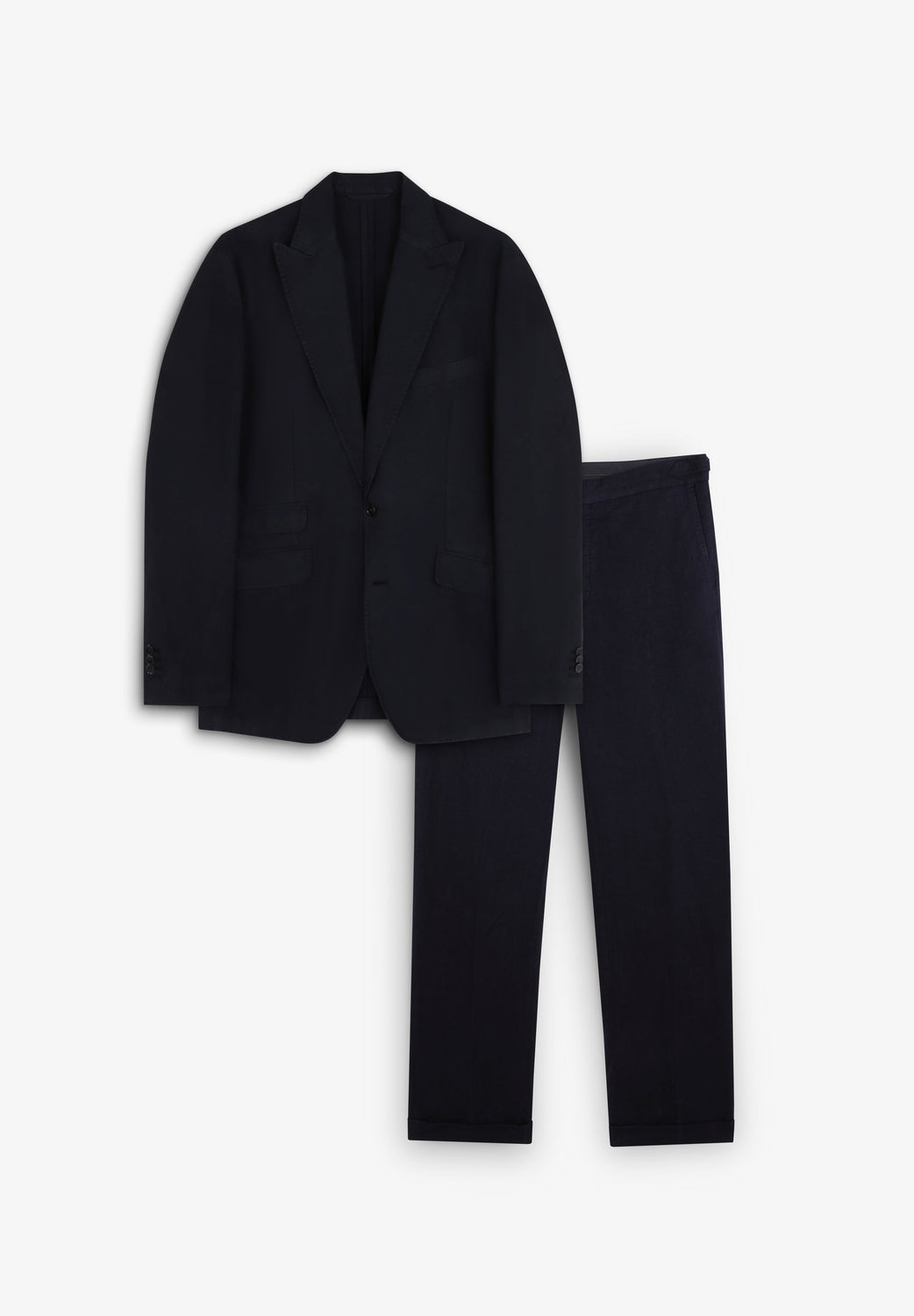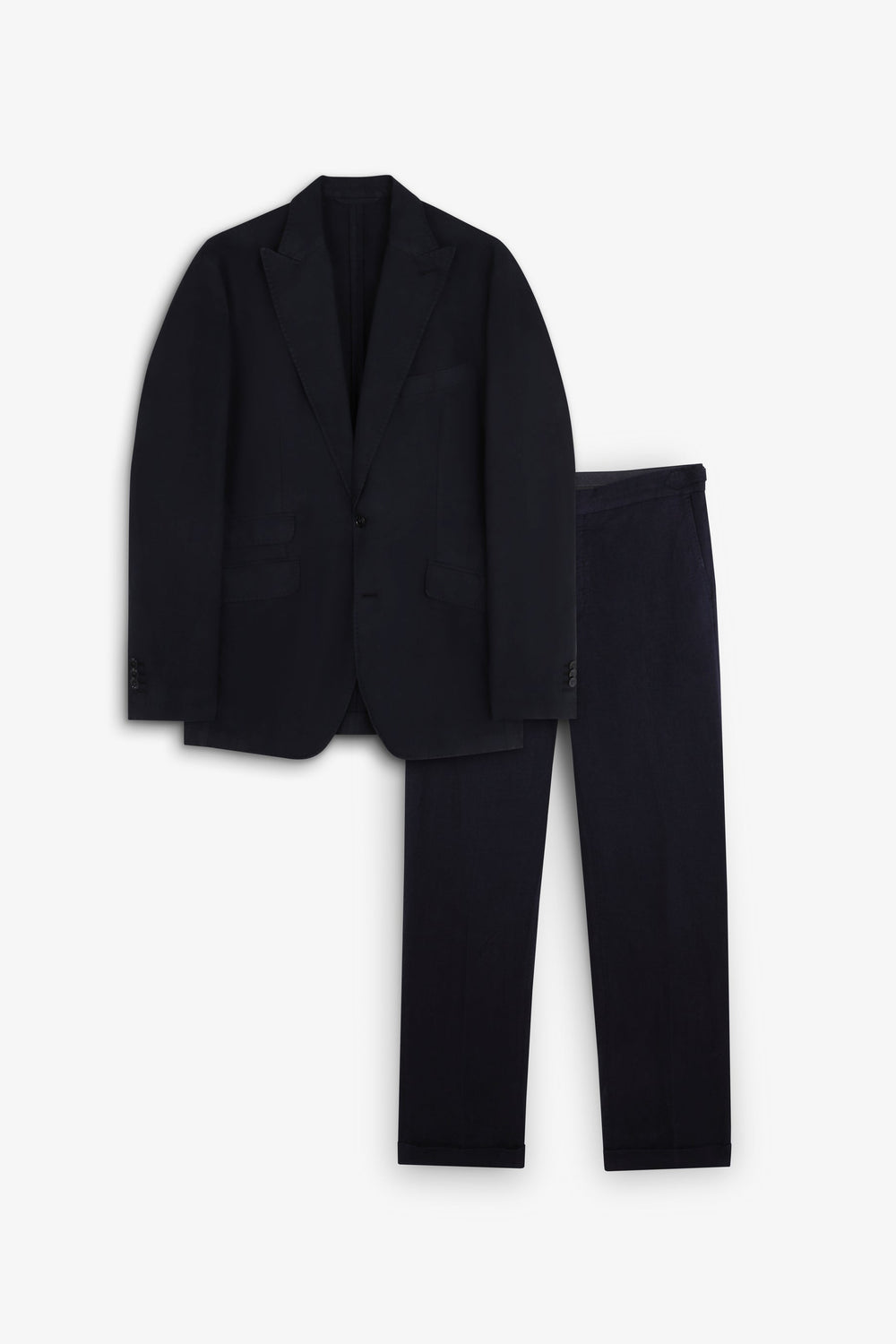 Americana ligera confeccionada en mezcla de Algodón y Lino. Corte regular fit. Cuello con solapas de muesca. Cierre con botones. Manga larga con botones. Bolsillo de parche. Pantalón de traje confeccionado en mezcla de algodón y lino. Cierre con cremallera y botón prolongado en cintura. Bolsillos inclinados delanteros y traseros con botón. Ceñidores laterales y botón para tirantes. Bajo con vuelta.