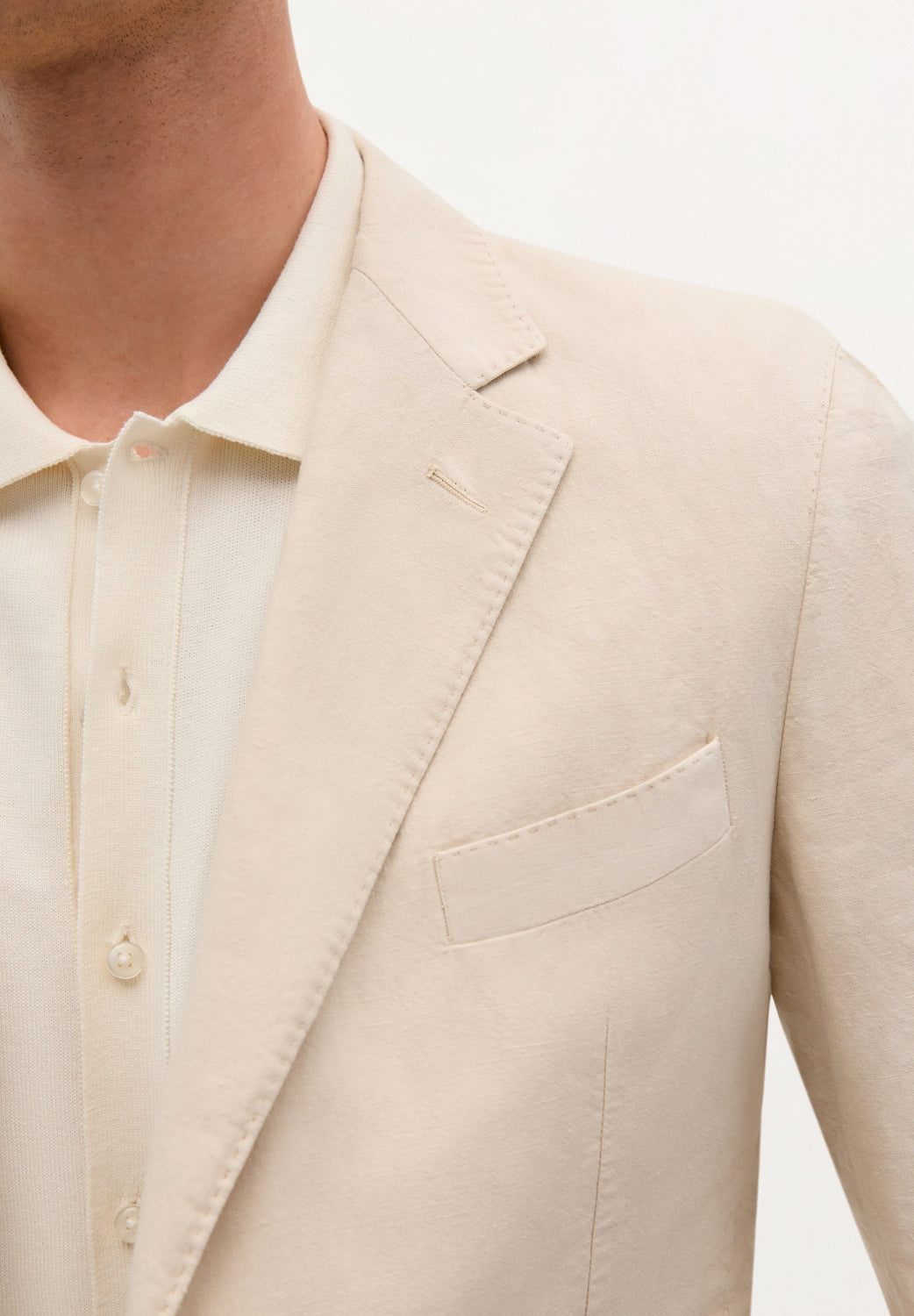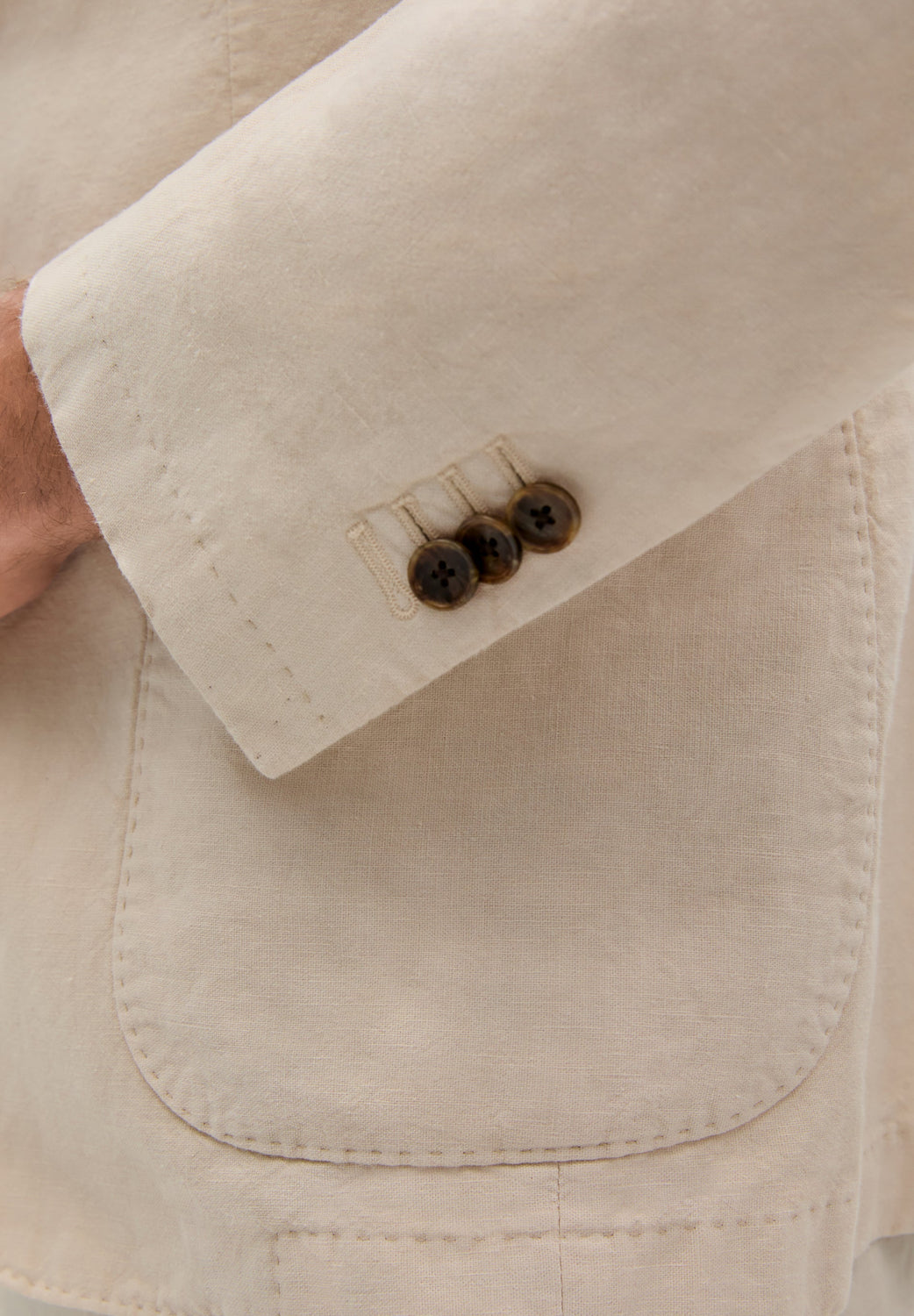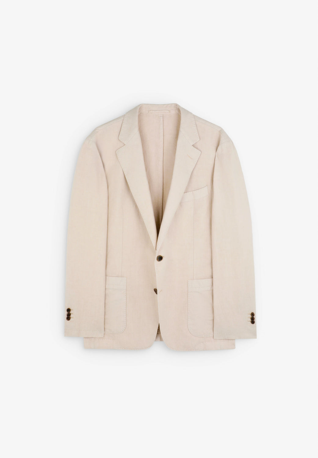 Americana ligera confeccionada en mezcla de Algodón y Lino. Corte regular fit. Cuello con solapas de muesca. Cierre con botones. Manga larga con botones. Bolsillo de parche.