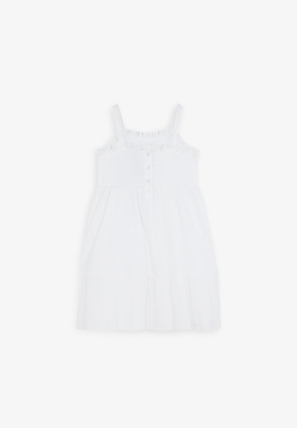 Vestido confeccionado en 100% Algodón Orgánico BCI. Cuello recto con detalle de volantes bordados. Estampado y tirantes bordados con motivo floral.