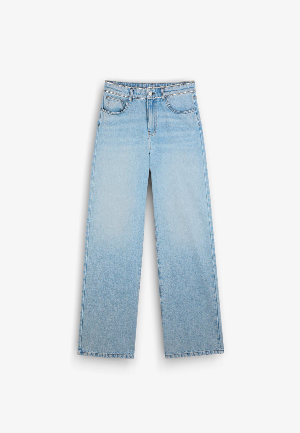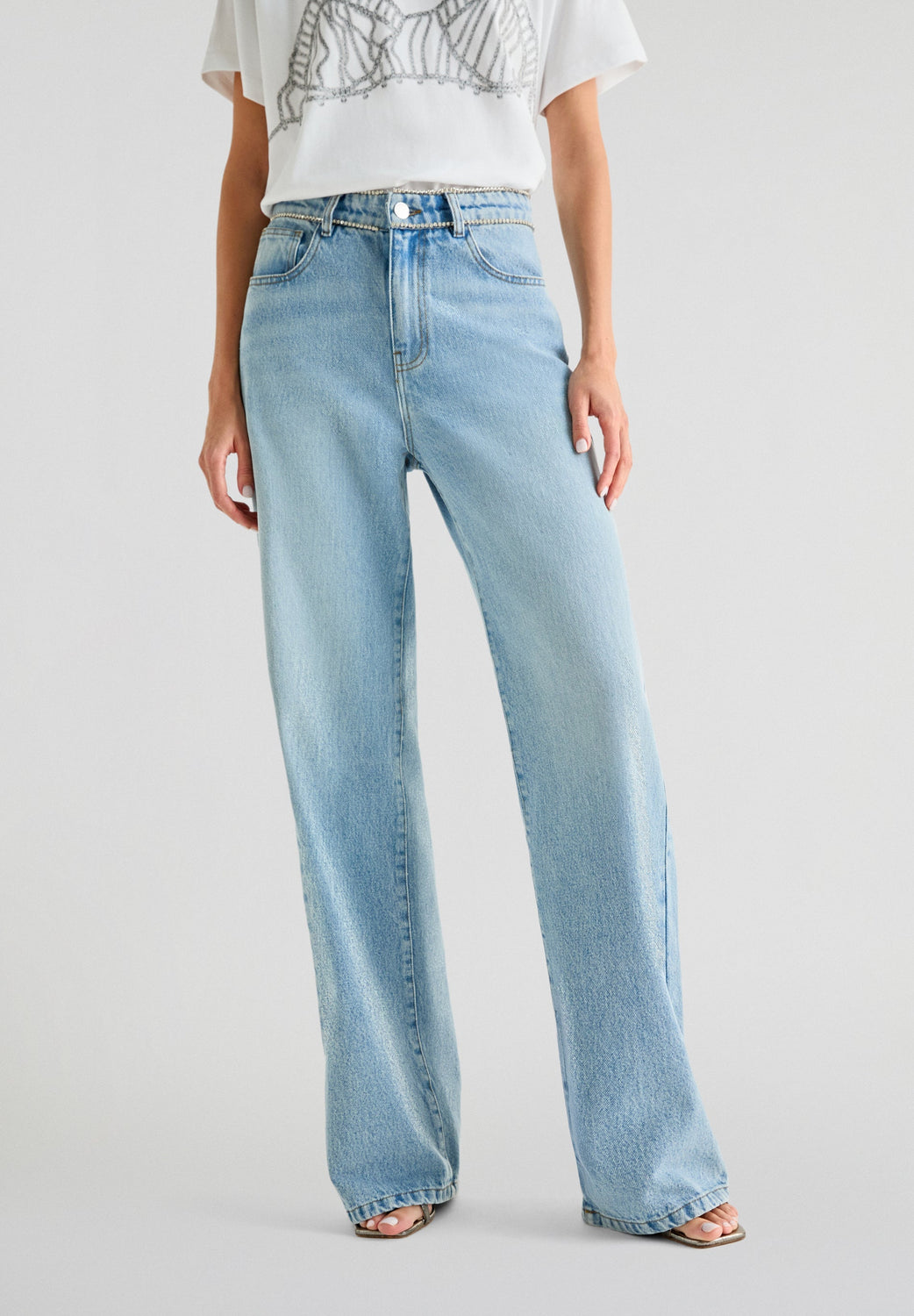 Jeans confeccionados en 100% algodón. Corte full length, cierre con botón y cremallera. Bolsillos delanteros y traseros y trabillas en cintura. Detalle de cristales en cintura.